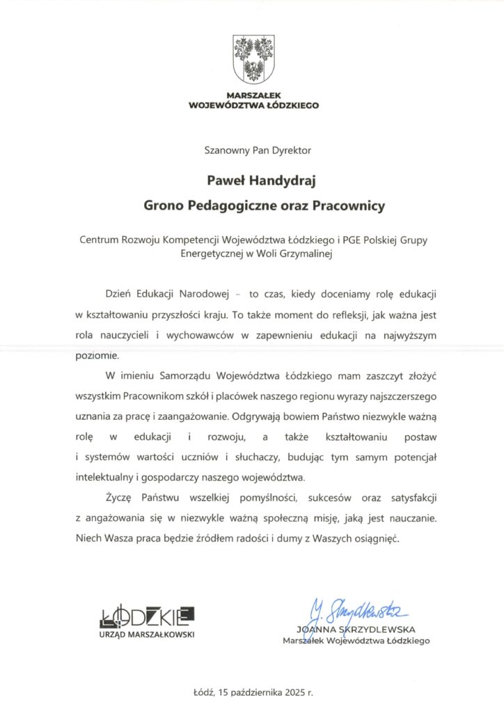 Z okazji Dnia Edukacji Narodowej Marszałek Województwa Łódzkiego Joanna Skrzydlewska skierowała również słowa uznania i podziękowania do całego grona pedagogicznego oraz pracowników Centrum Rozwoju Kompetencji Województwa Łódzkiego i PGE Polskiej Grupy Energetycznej w Woli Grzymalinej.