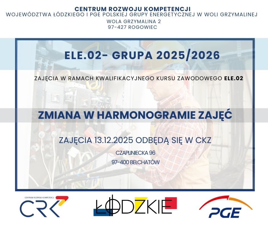 Informujemy, że zajęcia zaplanowane na 23.11.2025 odbędą się w Centrum Rozwoju Kompetencji WŁ i PGE (CRK) w Woli Grzymalinej.
