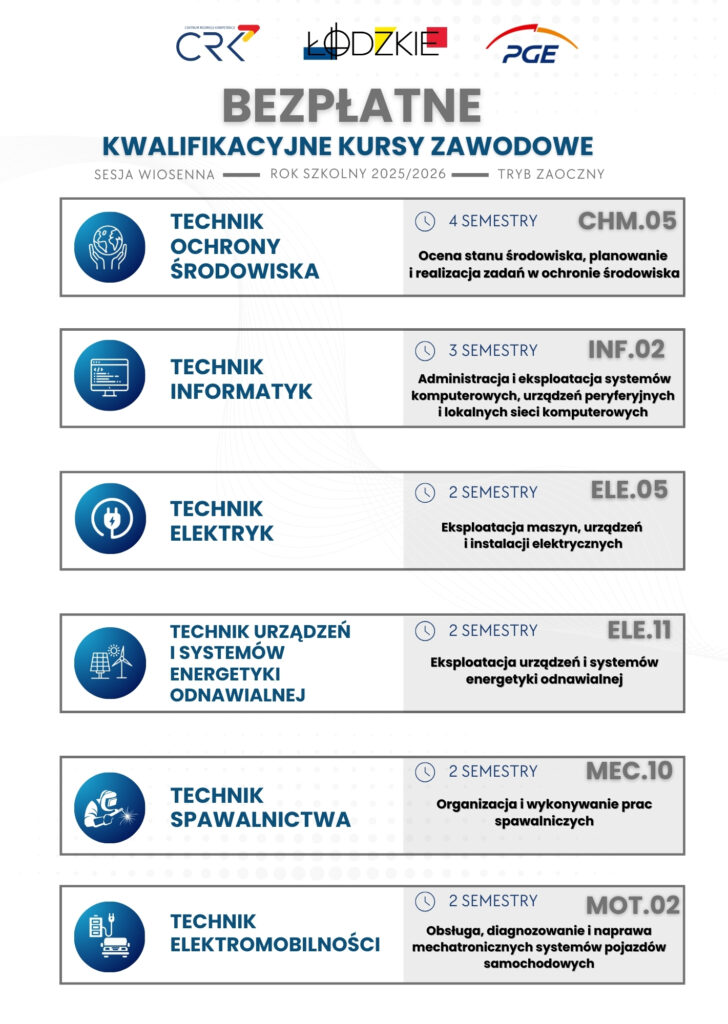 Zapraszamy na 𝗯𝗲𝘇𝗽ł𝗮𝘁𝗻𝗲 kwalifikacyjne kursy zawodowe w trybie zaocznym na rok szkolny 2025/2026 (sesja wiosenna).