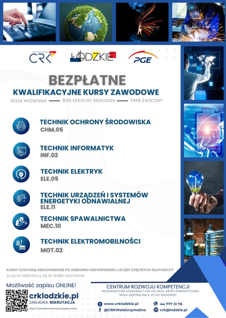 Centrum Rozwoju Kompetencji zaprasza do udziału w bezpłatnych kwalifikacyjnych kursach zawodowych, realizowanych w Woli Grzymalinej (Rogowiec- tuż obok Elektrowni Bełchatów).
